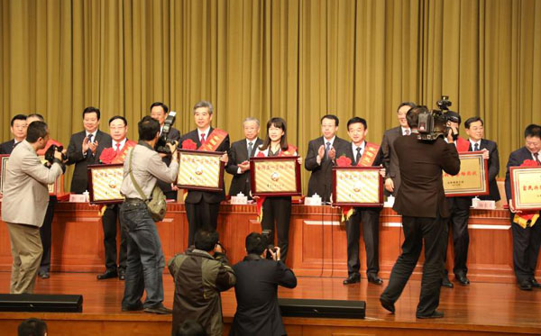 4月28日,山東省委書記劉家義、省長龔正等領(lǐng)導(dǎo)為山東省獲獎(jiǎng)單位授獎(jiǎng)。聯(lián)橋集團(tuán)黨委副書記宋威麗代表公司接受了省長龔正親自頒發(fā)的榮譽(yù)獎(jiǎng)牌。